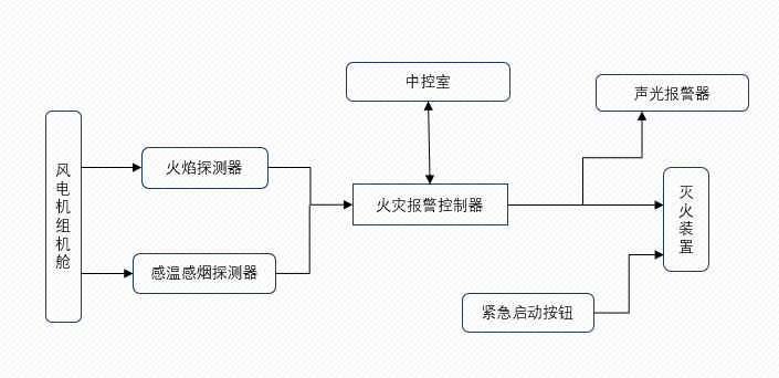 風(fēng)電機(jī)艙主動(dòng)防火系統(tǒng)由火災(zāi)探測(cè)和報(bào)警系統(tǒng)、煙霧控制和滅火系統(tǒng)組成。